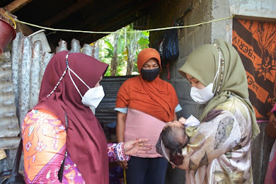 | Ketua GOW Tanah Datar Ny. Patty Richi Aprian dan rombongan, menggendong balita warga yang dikunjungi, bersamaan dengan mengantarkan bantuan sembako untuk warga prasejahtera.(ist) |