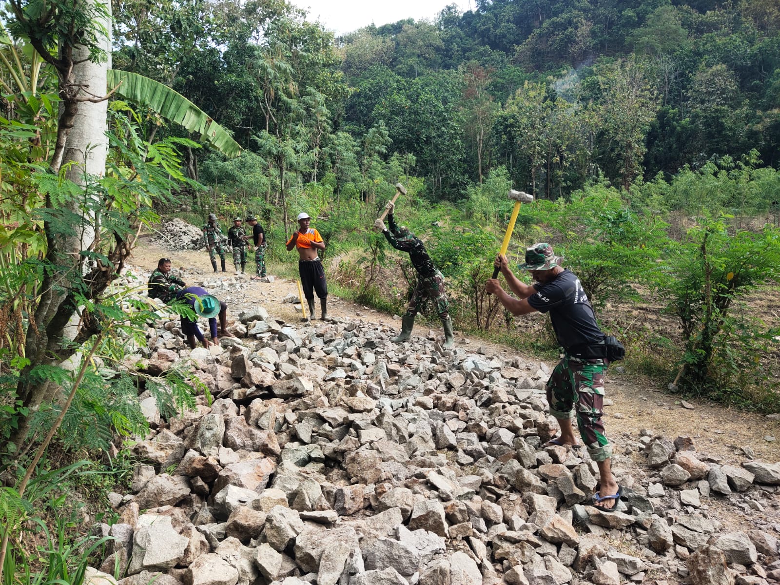 Tampak sudah sangat lihai dalam mengayunkan bogem untuk membelah batu di lokasi jalan makadam, Pratu Bayu ternyata sudah beberapa kali ikut TMMD jadi sudah tidak mengherankan, jika dia sudah sangat lihai dalam membelah batu tersebut.