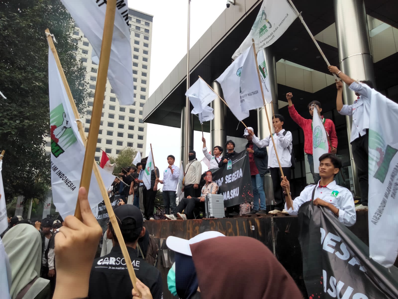 Pengurus Pusat Kesatuan Aksi Mahasiswa Muslim Indonesia (PP KAMMI) menggelar aksi di depan gedung KPK, Senin (23/12/2024). Massa aksi menuntut KPK segera menuntaskan kasus yang mandek di antaranya penangkapan Harun Masiku.