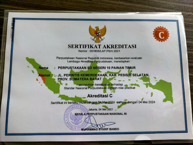 Sertifikasi Akreditasi Nasional dari Perpustakaan Nasional RI yang diraih SDN 10 Painan Timur berdasarkan evaluasi Lembaga Akreditasi Perpustakaan 2021. (ist)