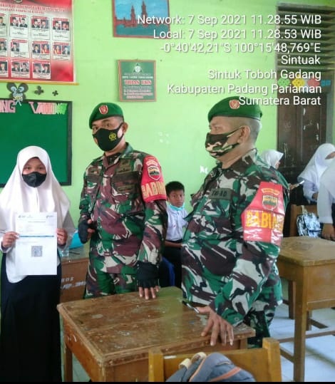 LubukAlung – Pelajar SMPN 1 Sintoga, Padang Pariaman mengikuti vaksinasi di sekolah setempat, Selasa kemarin. Vaksinasi yang dilakukan oleh tenaga kesehatan itu dipantau dan diawasi oleh Babinsa Koramil 05/Lubuk Alung,  Serda Topitman.
