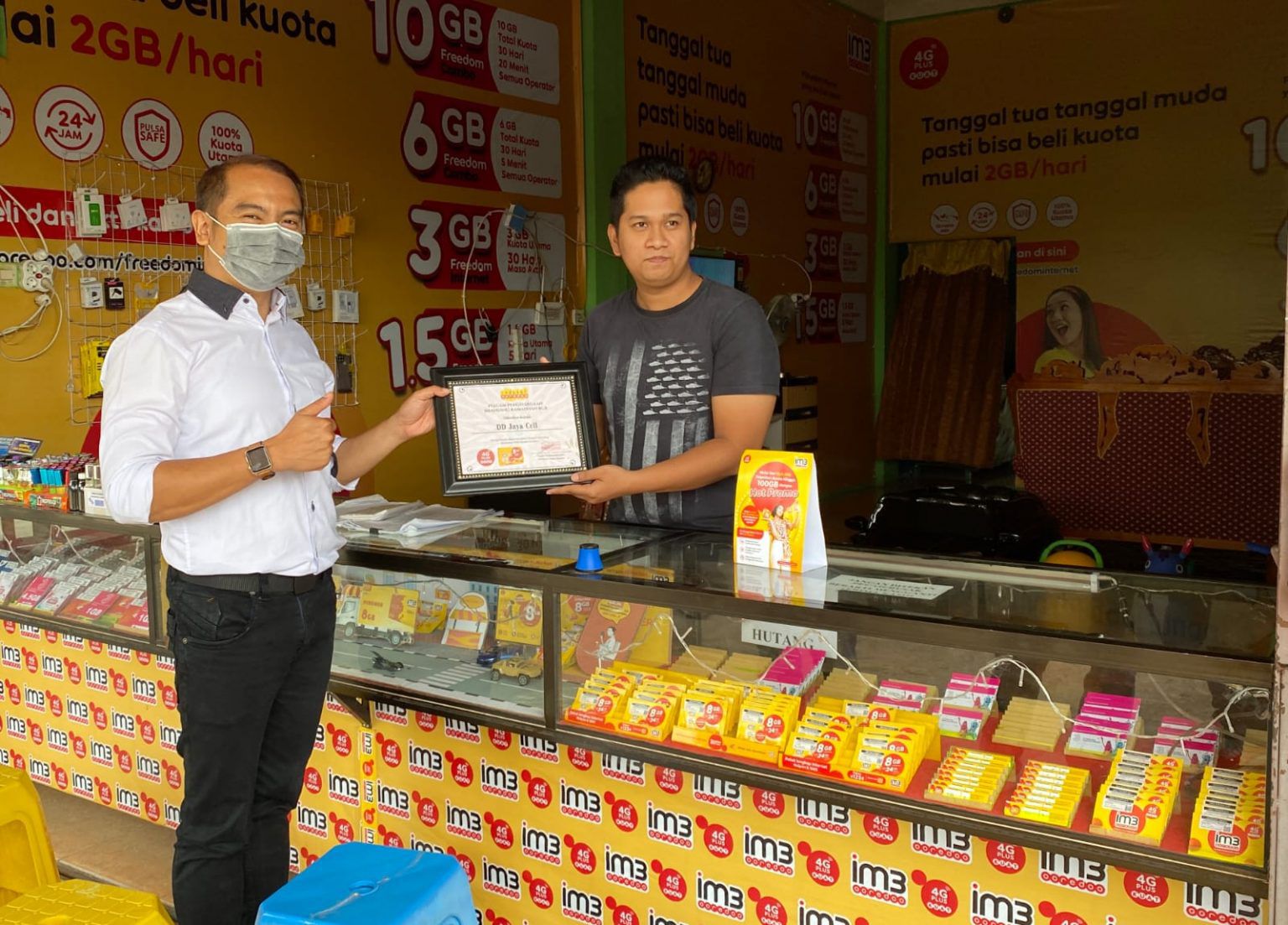 | SVP Head of Region Sumatera Indosat, Fahd Yudhanegoro, memberikan penghargaan pada salah satu outlet mitra Indosat. (ist) |