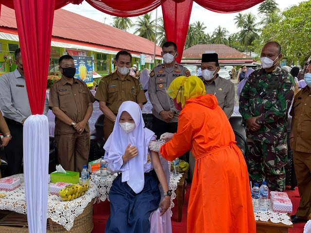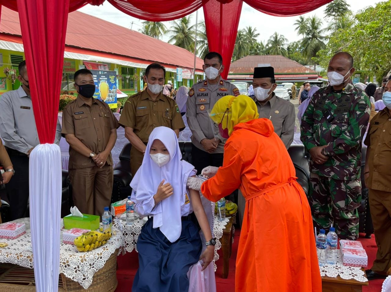 | Seorang pelajar di SMPN 1 Nan Sabaris tengah menerima suntik vaksin Covid, Selasa (24/8). (ist) |