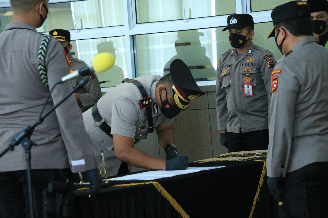 Salah seorang Kapolres yang mengikuti prosesi serah terima jabatan di Mapolda Sumbar menandatangi berita acara serah terima. (ist)