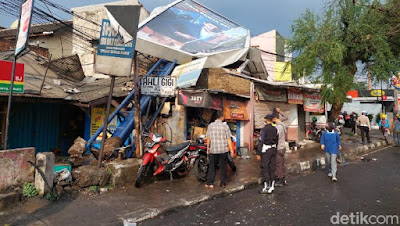 Tak cuma baliho raksasa itu saja, hujan disertai angin kencang itu juga turut merobohkan pohon serta atap bangunan milik warga. Beruntung tak ada korban jiwa akibat robohnya pohon dan atap rumah warga.