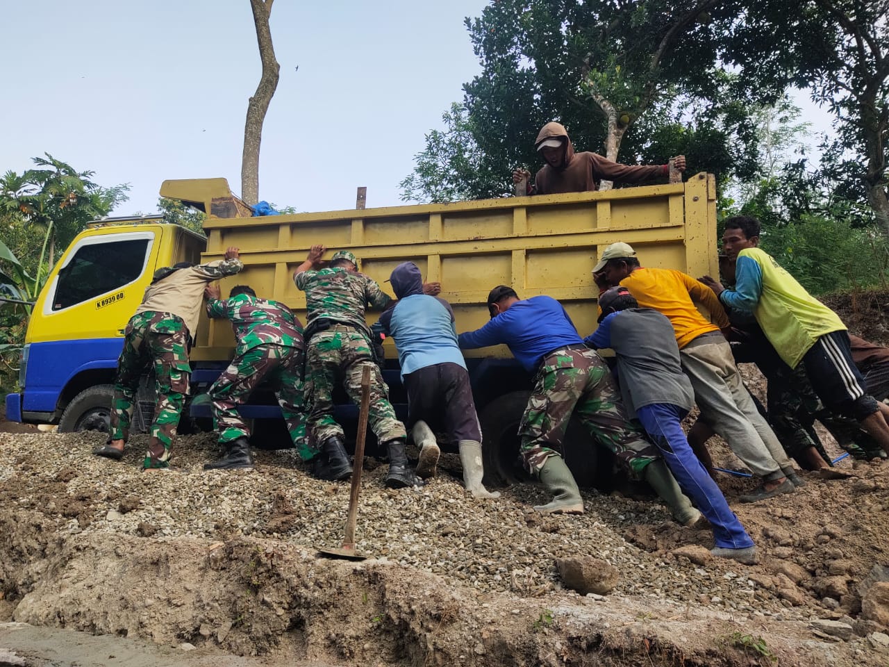 Dia menambahkan, dengan bantuan dorongan dari beberapa anggota satgas serta warga, akhirnya dump truck tersebut dapat melewati tanah yang gembur.
