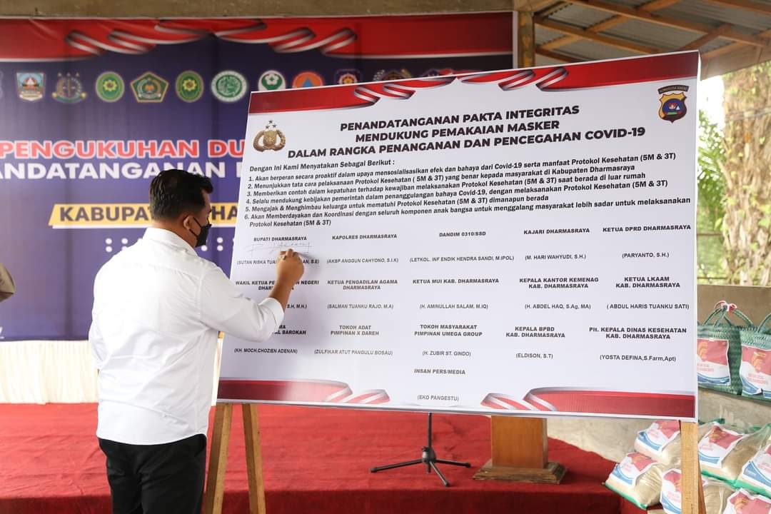 Dharmasraya – Bupati Dharmasraya, Sutan Riska Tuanku Kerajaan, Kapolres Dharmasraya, AKBP Anggun Cahyono, unsur Forkopimda, tokoh agama, tokoh adat, tokoh masyarakat dan insan pers, menandatangani Pakta Integritas dalam rangka penanganan dan pencegahan Covid-19 di wilayah itu, Kamis ( 22 /7 ).