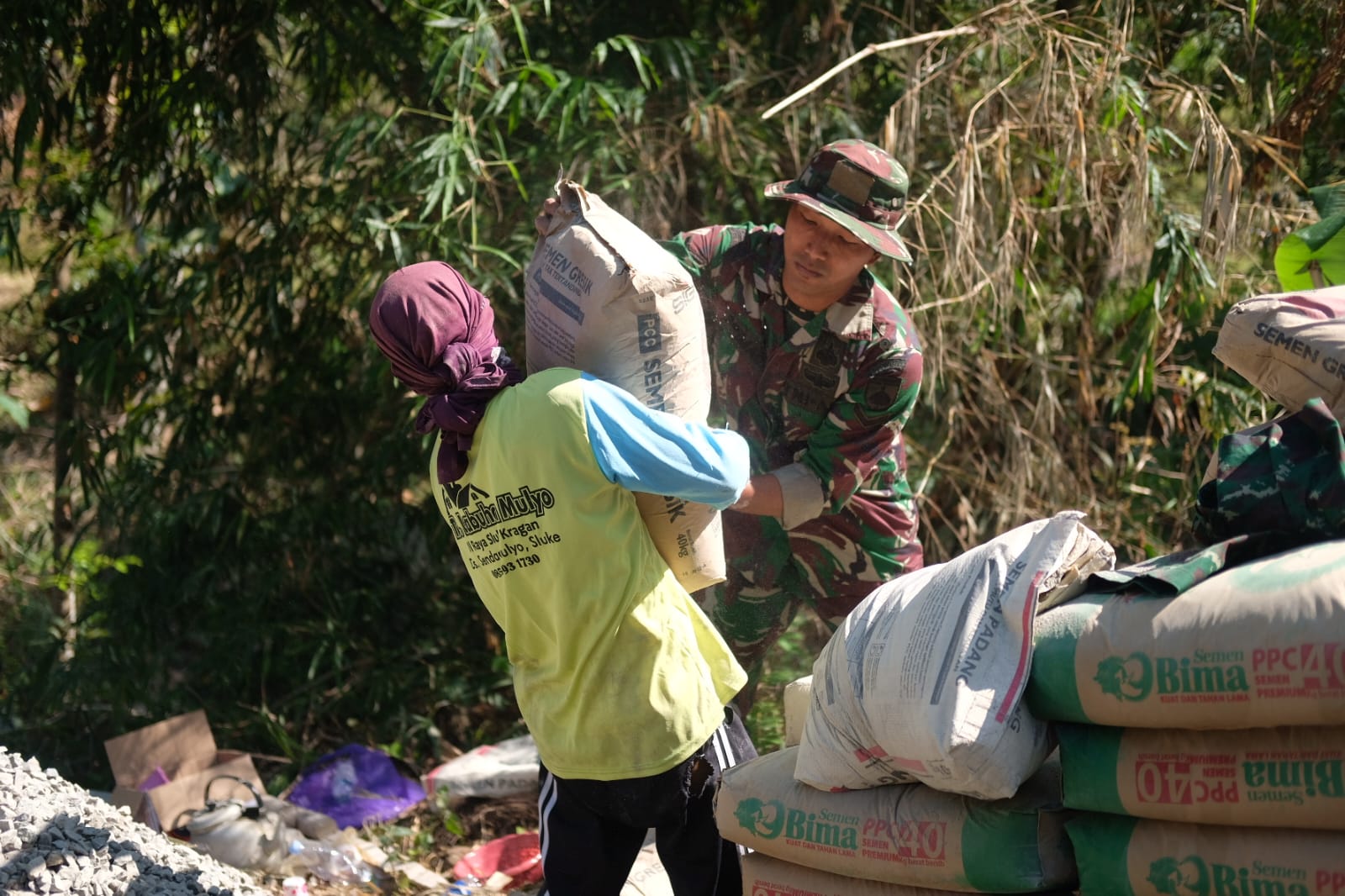 Dengan penuh semangat, Pratu Saefudin bersama warga mengangkut semen semen dan meletakkan di dekat mesin molen.