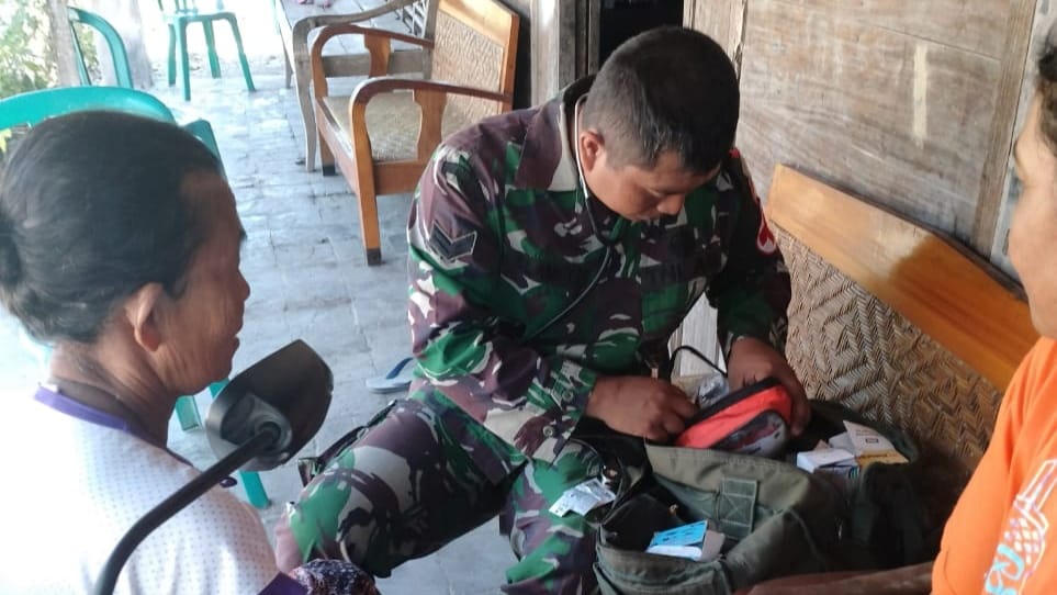 Sepeti yang dilakukan oleh Sertu Selamet tenaga kesehatan yang tergabung di dalam TMMD Reguler ke-121 Kodim 0720/Rembang sedang melaksanakan pengecekan kesehatan kepada salah satu warga Labuan Kidul Kecamatan Sluke Kabupaten Rembang yang sedang bergotong royong dalam pembuatan jembatan.