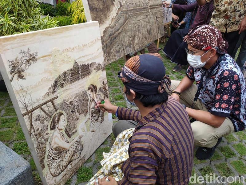 “Mulai tahun 2003 saya pertama melukis pakai puntung rokok dan obat nyamuk bakar,” kata Wawan Geni saat ditemui di sela-sela menyelesaikan lukisan di Balkondes Karangrejo Borobudur, beberapa waktu lalu.