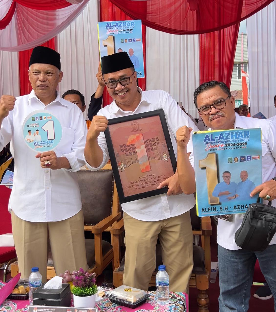 Sungai Penuh – Setelah KPU resmi menetapkan nomor urut pasangan calon Walikota dan Wakil Walikota Sungai Penuh, pasangan Alfin – Azhar (Al – Azhar) mendapat kehormatan nomor urut 1 pada Senin, 23 September 2023.