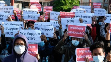Sejumlah warga mendukung keberadaan National Unity Government (NUG), pemerintahan tandingan junta militer Myanmar. (AFP/STR)