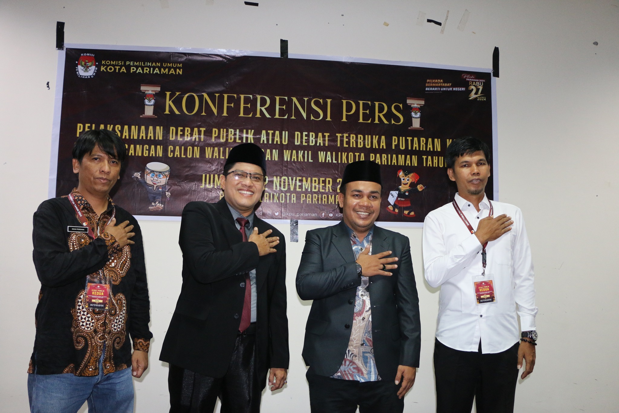 “Berbeda dengan debat pertama, debat kedua kita juga telah memberikan ruang yang lebih banyak untuk pasangan calon membawa pendukung. Tidak hanya dalam ruangan debat, pendukungpun juga bisa menyaksikan debat di Halaman Balaikota Pariaman melalui tiga layar yang telah kita siapkan untuk masing – masing pendukung dengan harapan debat ini akan berjalan dengan kondusif, “ tambahnya.
