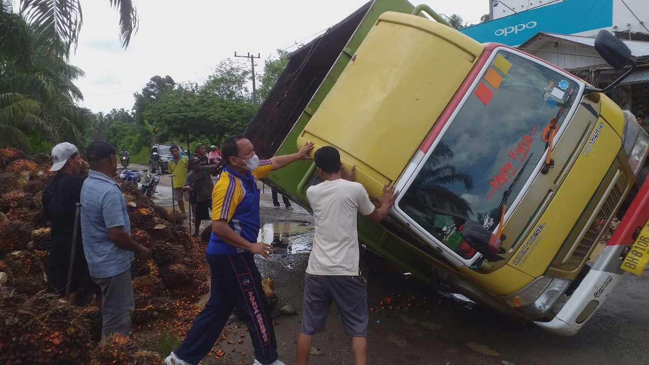 “Satu truk yang bermuatan tandan buah sawit rebah kuda di jalan lintas provinsi Sumatera lama di Jorong Sungai Duo, Nagari Sungai Duo yang diduga akibat jalan berlobang,” kata dia.