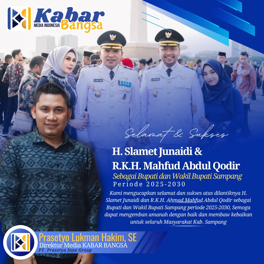 Sampang, Fativa.id Direktur Media Kabarbangsa.com Prasetya Lukman hakim beserta seluruh Jajaran ruedaksi Media Kabarbangsa.com mengucapkan selamat dan sukses atas dilantiknya H. Slamet Junaidi sebagai Bupati dan R.K.H Mahfud Abdul Qodir sebagai Wakil Bupati Sampang untuk periode 2025–2030. Kamis 20 Februari 2025.