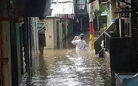 | Banjir landa pemukiman penduduk di Jakarta. |