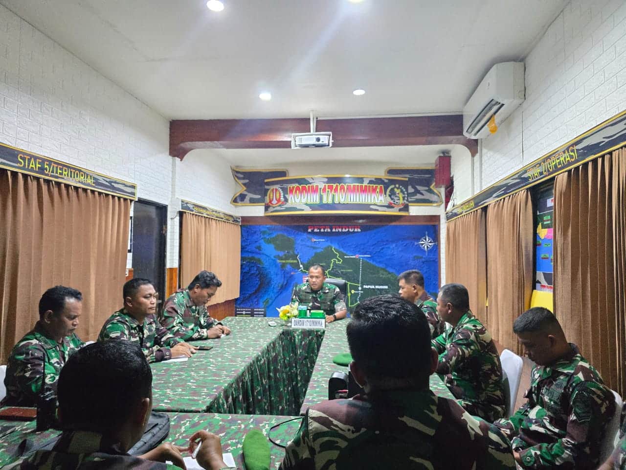 Timika , Fativa.id- Untuk menyamakan persepsi dan visi dalam pelaksanaan tugas, Dandim 1710/Mimika, Letkol Inf M. Slamet Wijaya, S.Sos., M.Han., M.A. melaksanakan rapat dengan jajaran Staf dan Koramil, Senin (03/03/2025). Kegiatan ini dilaksanakan di ruang data Makodim 1710/Mimika, Distrik Kuala Kencana, Kabupaten Mimika dan diikuti oleh semua Perwira Staf dan Danramil atau yang mewakili.