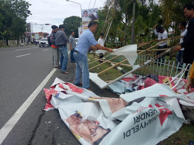 Sejumlah petugas menurunkan alat peraga kampanye (APK) saat minggu tenang. Di Sumbar ada empat walikota bakal di pilih pada 27 Juli |