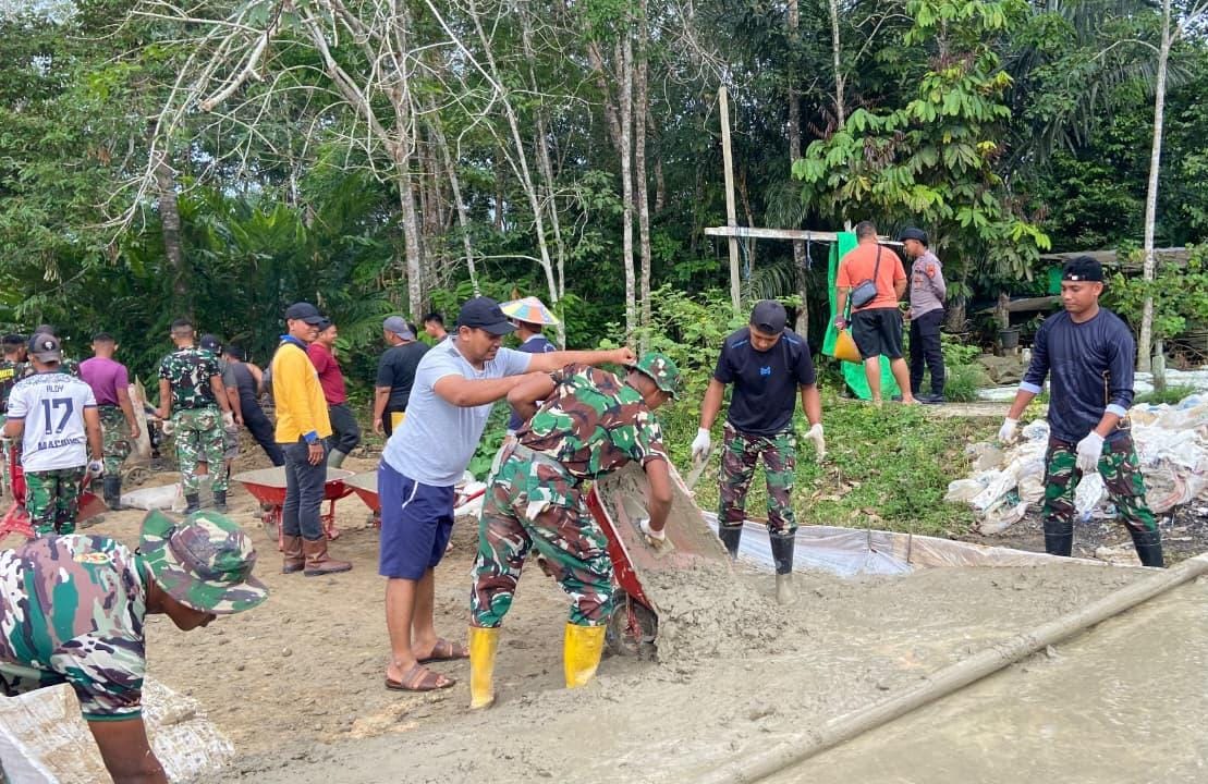 Kutai Barat – Memasuki hari ke-5 pelaksanaan, anggota Satgas TMMD Wiltas Ke-127 Kodim 0912/Kutai Barat bersama masyarakat terus bahu-membahu melanjutkan pengecoran jalan semenisasi di RT 01 Kampung Linggang Amer, Kecamatan Linggang Bigung, Kabupaten Kutai Barat, Sabtu (14/2/2026).