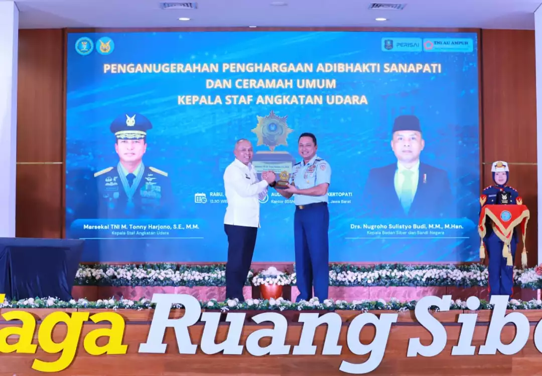 Jakarta – Kepala Staf Angkatan Udara (Kasau) Marsekal TNI M. Tonny Harjono menerima Tanda Penghargaan Adibhakti Sanapati dari Badan Siber dan Sandi Negara (BSSN) sebagai bentuk apresiasi atas jasa, darma bhakti, serta komitmen dalam penguatan keamanan siber dan persandian nasional.