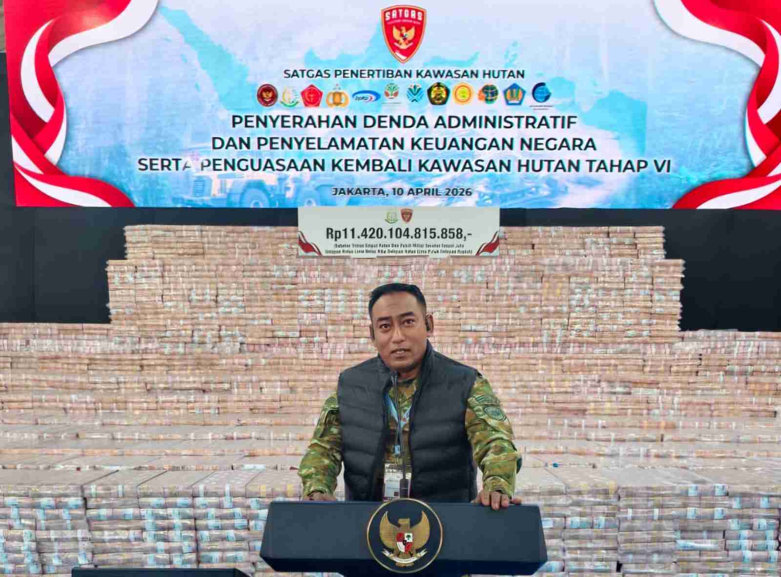 Jakarta – Asisten Personalia (Aspers) Dankodaeral XIII/Tarakan sekaligus Dankorwil NTB-NTT Satgas PKH Garuda, Kolonel (Mar) Achmad Hadi Alhasny, menghadiri penyerahan uang sebesar Rp11,4 triliun hasil penagihan denda administratif kehutanan oleh Satuan Tugas Penertiban Kawasan Hutan di Kejaksaan Agung Republik Indonesia, Jakarta, Jumat (10/4/2026).